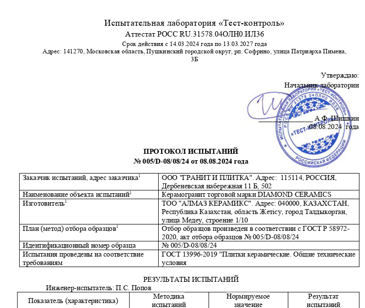 Протокол испытаний на керамогранит 2024