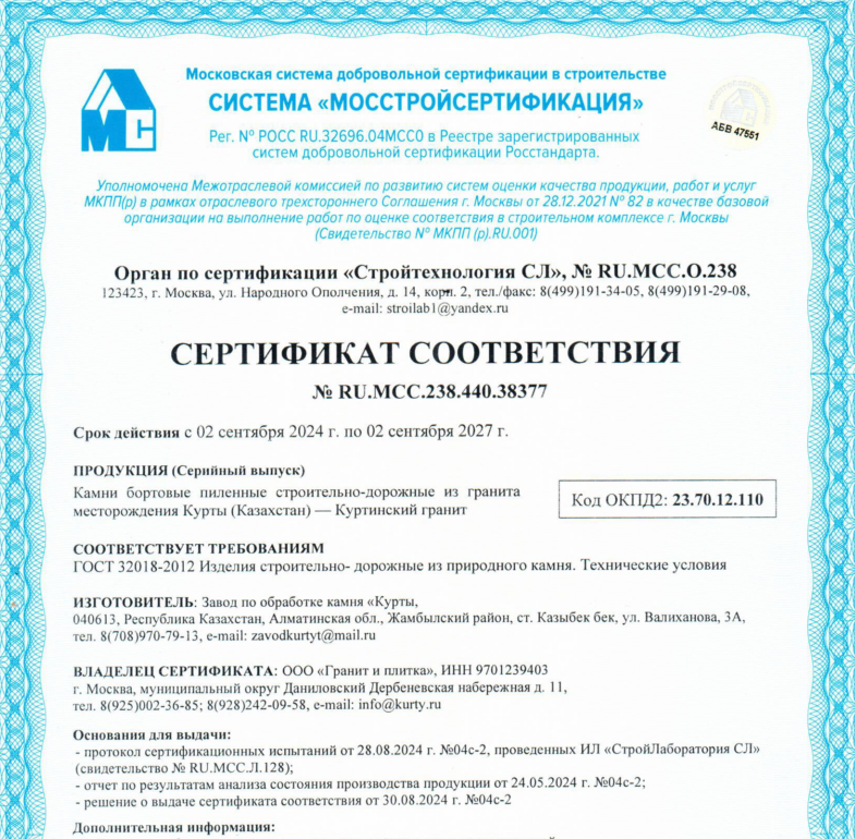 Сертификат соответствия - куртинский гранит