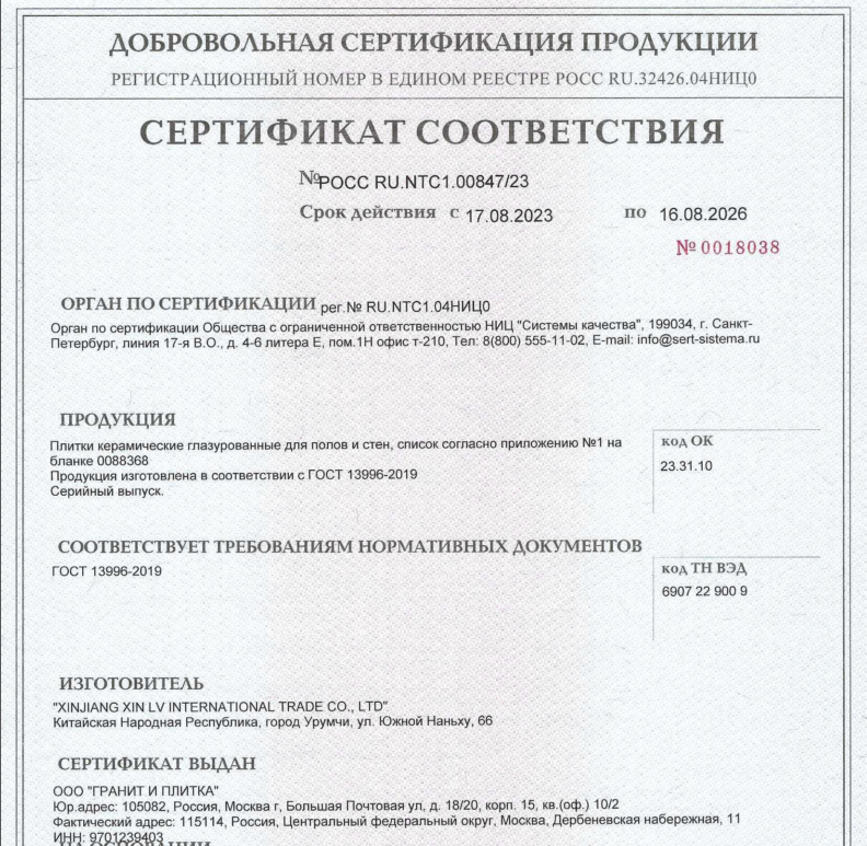 Сертификат соответствия - керамогранит